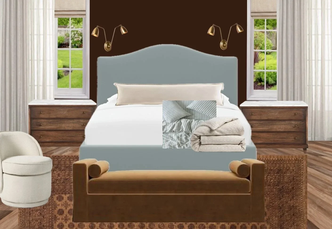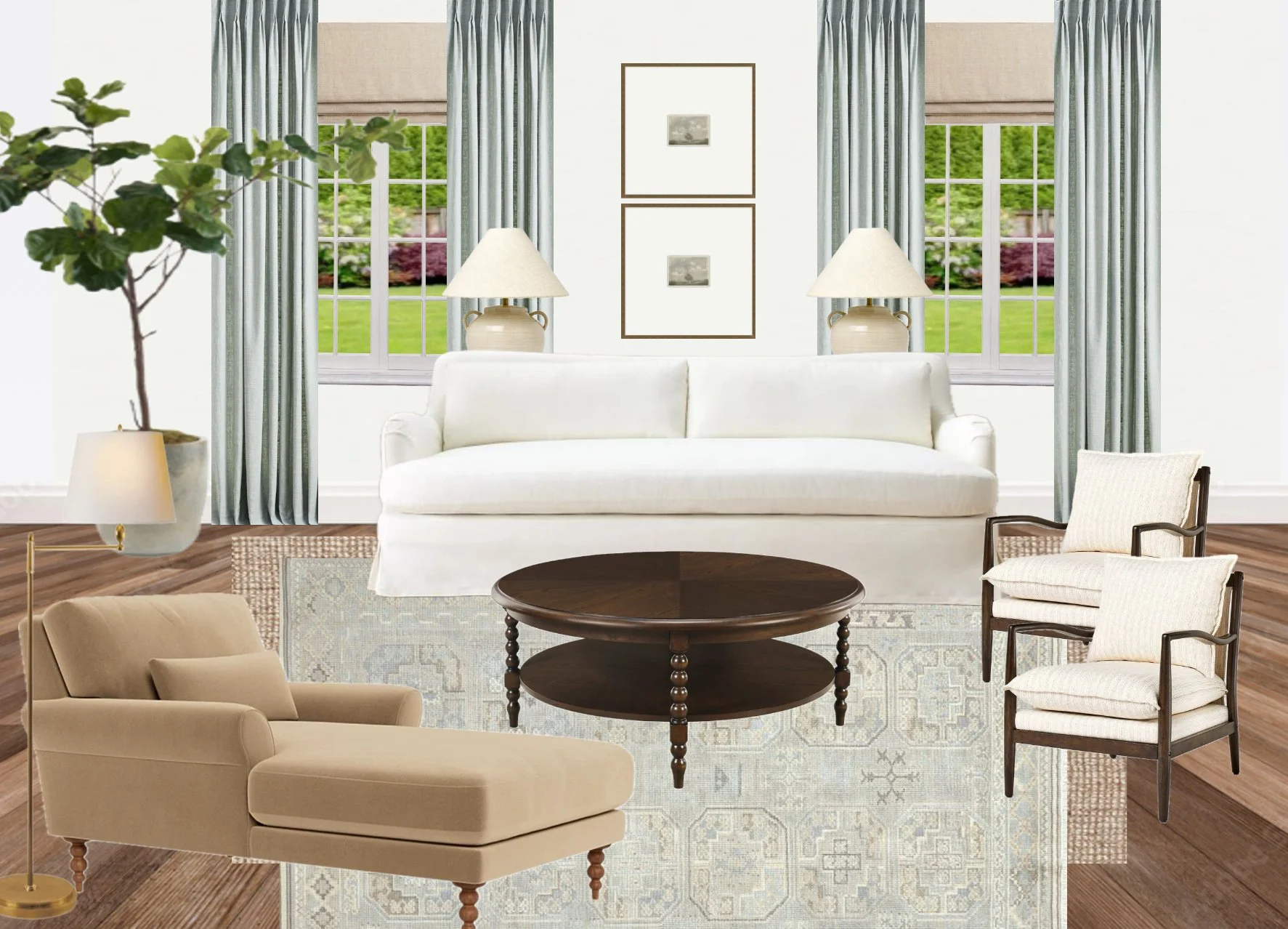 After receiving payment, photographs/measurements, and inspirations, I will compile your personalized design proposal. The initial proposal consists of several digital floor plan layout options and 2D design scheme renderings. The renderings showcase architectural details (e.g., windows, doorways), product recommendations, and layers of proposed textiles and colors.